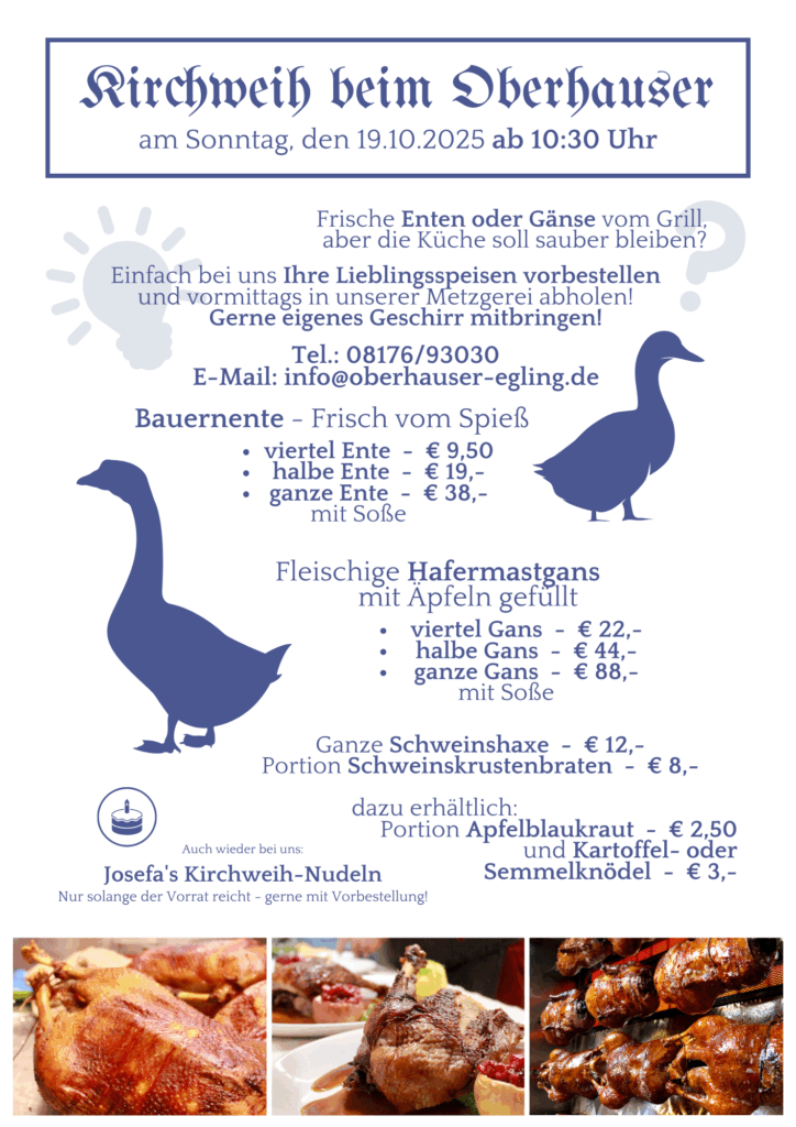 Rufen Sie uns an unter Tel.: 08176/93030 oder schreiben Sie eine E-Mail an info@oberhauser-egling.de. Schnell sein lohnt sich – auch unsere beliebten Josefa’s Kirchweih-Nudeln sind wieder verfügbar, solange der Vorrat reicht!