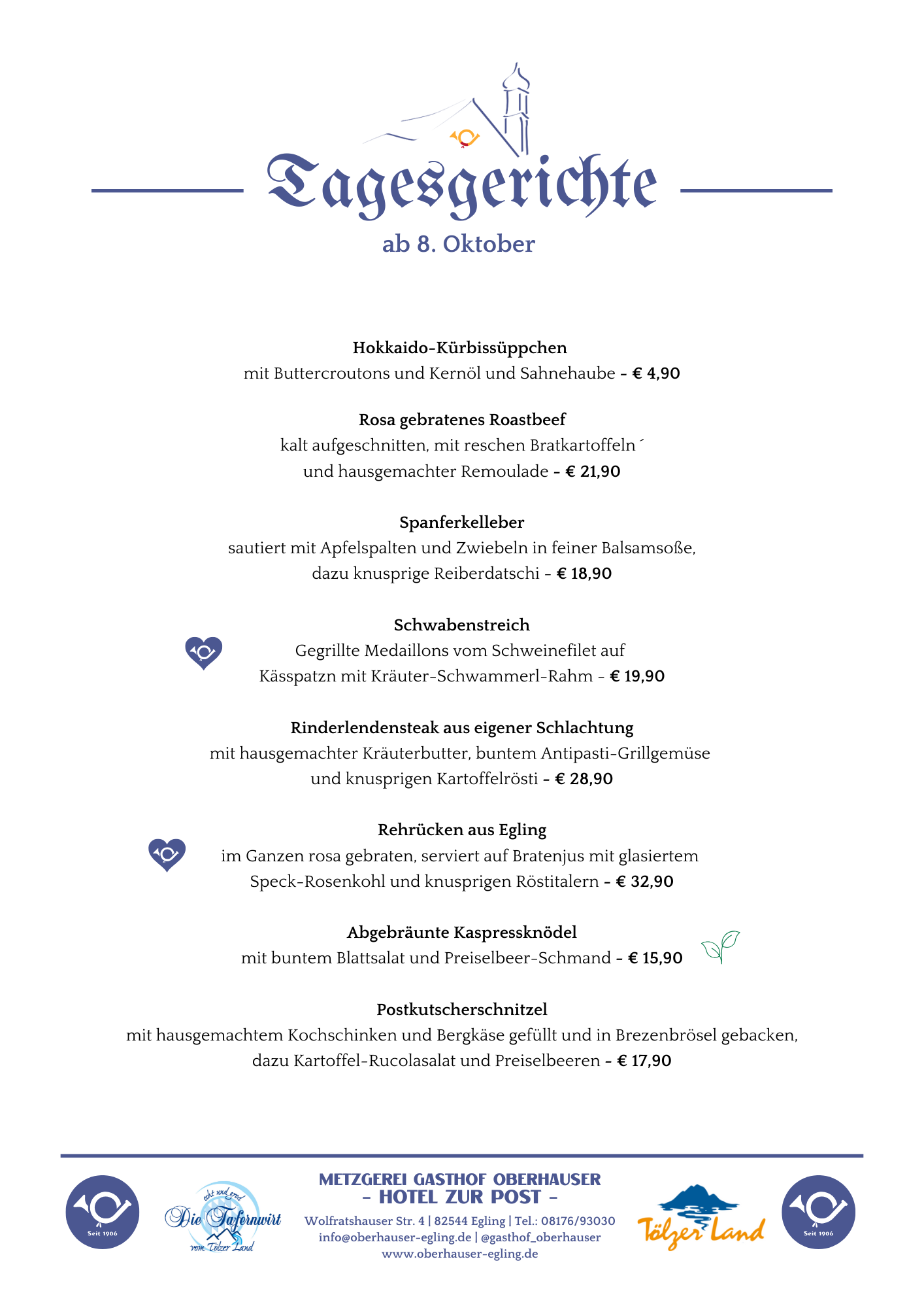 Deftige Schmankerl und Gerichte stehen auf unserer Speisenkarte. Tagesempfehlungen und saisonale Spezialitäten runden das kulinarische Angebot ab. Fleisch und Wurst stammen selbstverständlich aus der eigenen Metzgerei, Fische aus heimischen Gewässern.